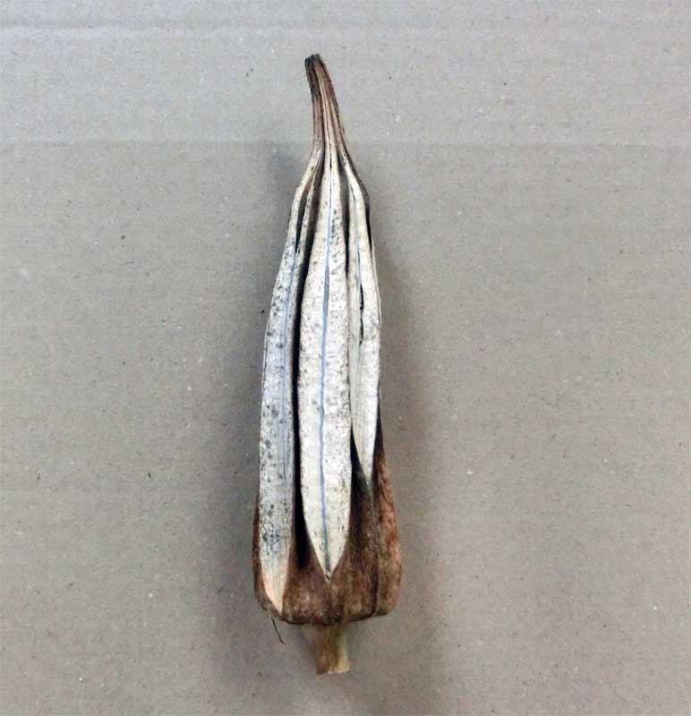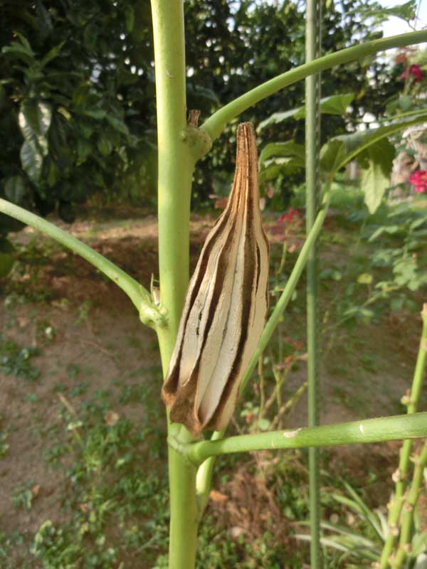 ちなみに、種を採取すると決めた後もその木でオクラ栽培は続け実を採ってます。今も花を咲かせ実を採ってます。