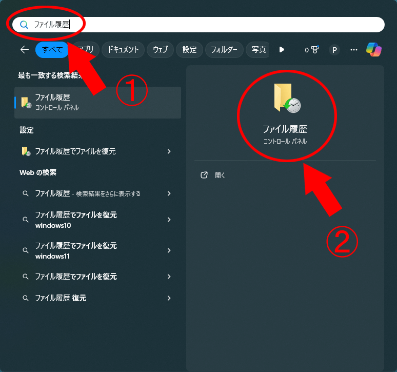 「検索」窓で「ファイル履歴」と入力【①】。