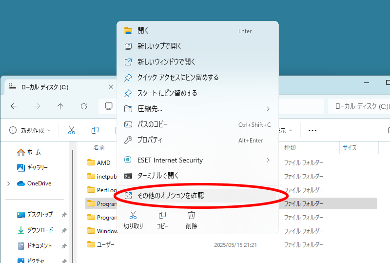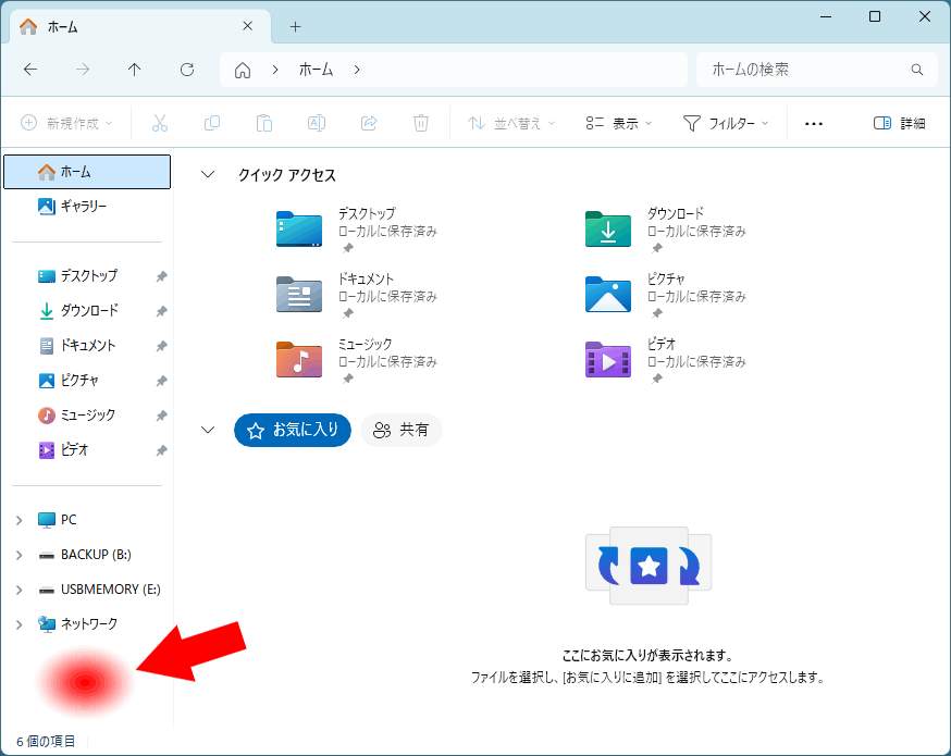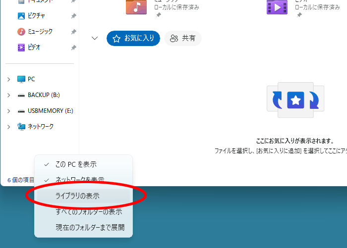 エクスプローラーを開いて左側の何もない場所でマウスの右ボタンをクリックします。