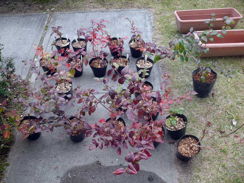 今年発根して小さなポリポットで育苗していたブルーベリーたちの中で育成状況のいいものと、昨年発根し育苗していた挿し木苗と、をさらに大きいポリポットに鉢増ししました。